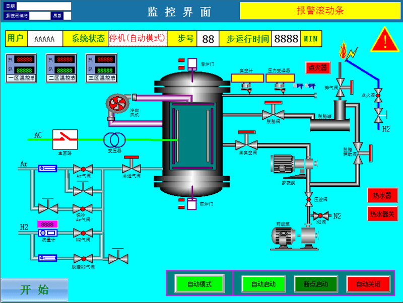 通過我們公司的系統(tǒng)可以時(shí)時(shí)監(jiān)控水壓、電壓、氣壓。能按工藝自動完成生產(chǎn)。有效的節(jié)省人力、物力等方面的成本。提高了產(chǎn)品的合格率。為公司創(chuàng)造更大的利潤。我們的軟件廣泛用于高真空釬焊爐、石墨化爐、碳化爐、TP爐、熔煉爐、碳化硅燒結(jié)爐、金屬鉭片爐、鎢絲高溫真空爐、藍(lán)鎢爐等